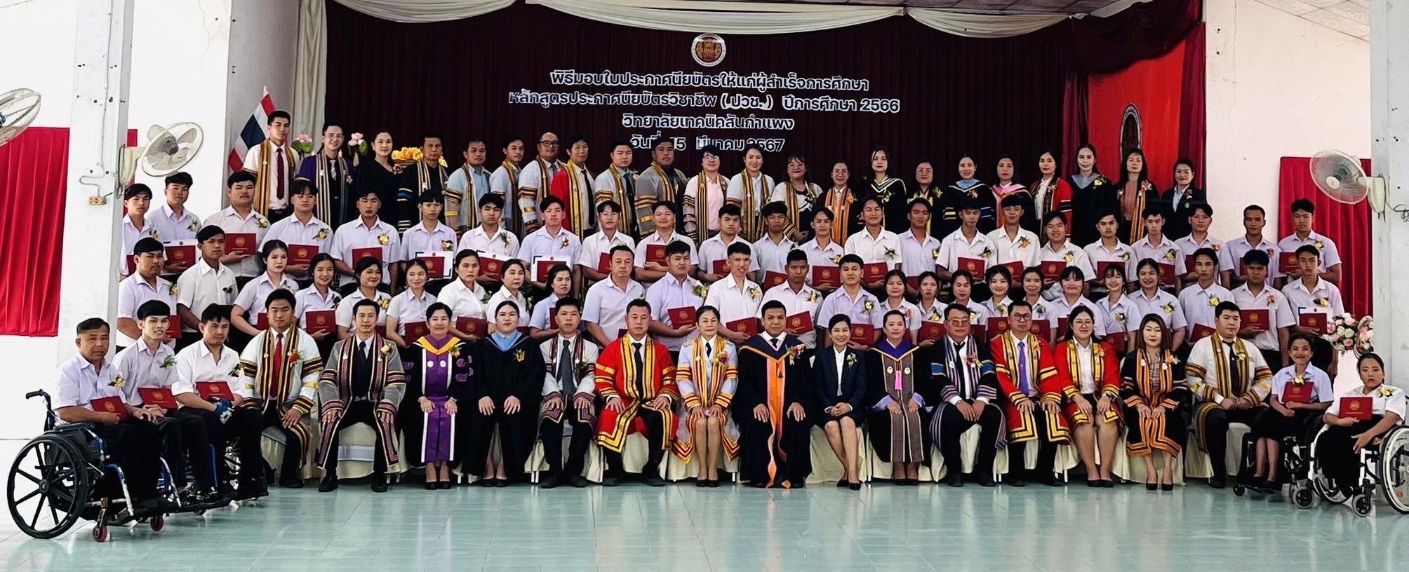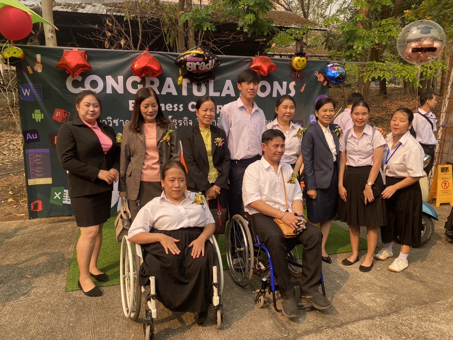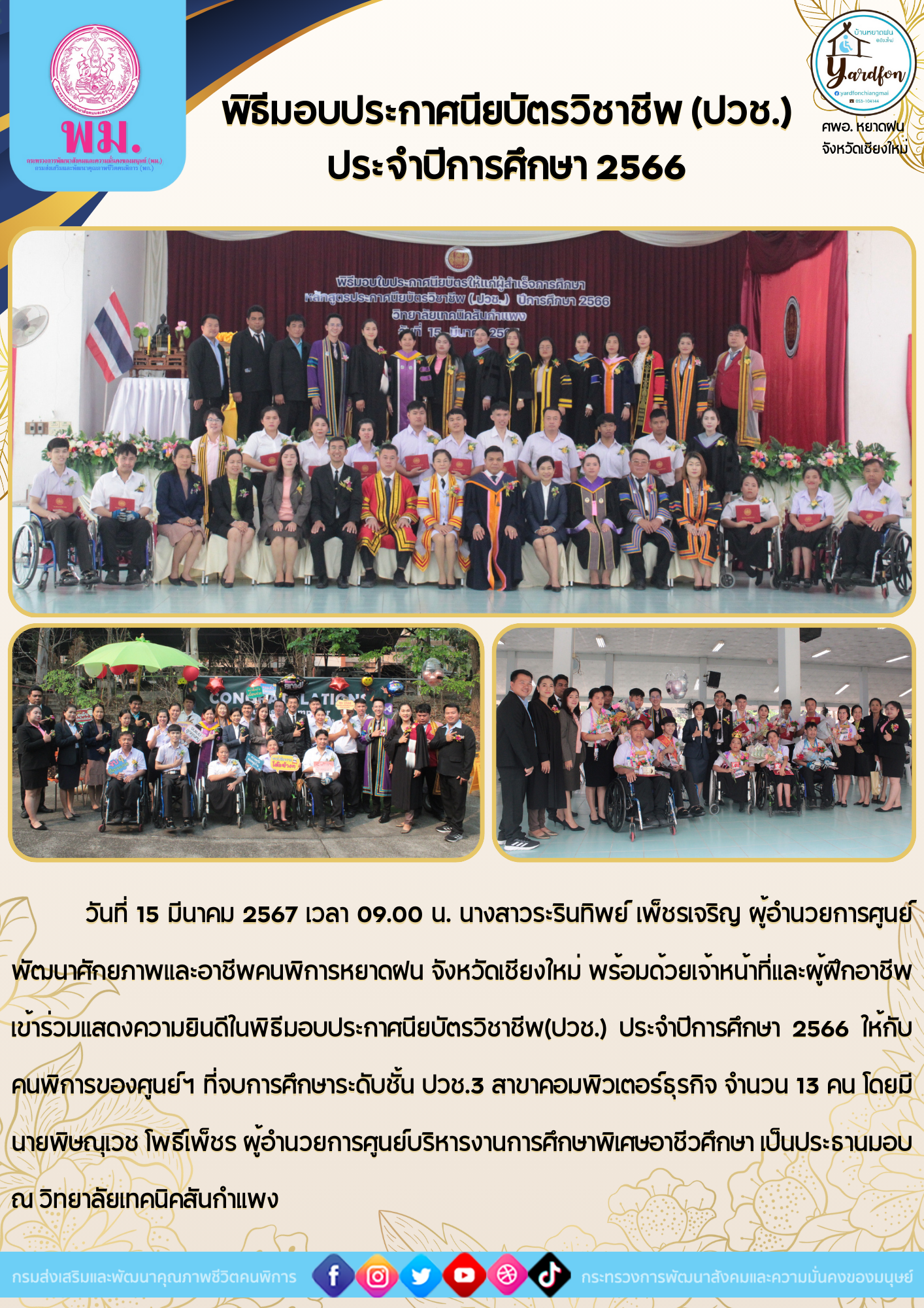 นางสาวระรินทิพย์ เพ็ชรเจริญ ผู้อำนวยการศูนย์พัฒนาศักยภาพและอาชีพคนพิการหยาดฝน จังหวัดเชียงใหม่ พร้อมด้วยเจ้าหน้าที่และผู้ฝึกอาชีพ เข้าร่วมแสดงความยินดีในพิธีมอบประกาศนียบัตรวิชาชีพ(ปวช.) ประจำปีการศึกษา 2566 ให้กับคนพิการของศูนย์ฯ ที่จบการศึกษาระดับชั้น ปวช.3 สาขาคอมพิวเตอร์ธุรกิจ จำนวน 13 คน โดยมีนายพิษณุเวช โพธิ์เพ็ชร ผู้อำนวยการศูนย์บริหารงานการศึกษาพิเศษอาชีวศึกษา เป็นประธานมอบณ วิทยาลัยเทคนิคสันกำแพง
