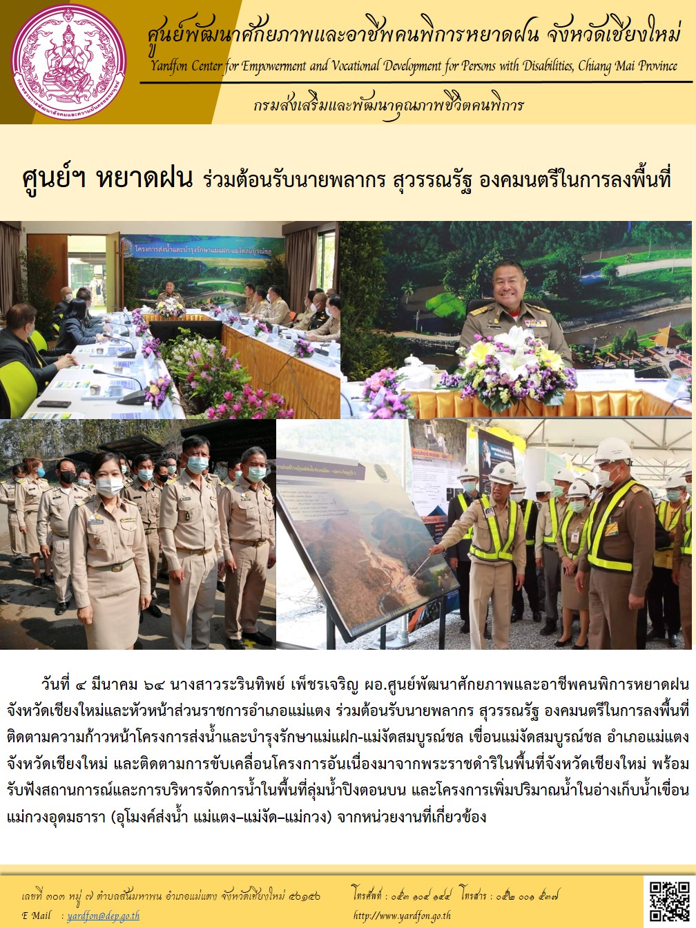 วันที่ 4 มีนาคม 64 นางสาวระรินทิพย์ เพ็ชรเจริญ ผอ.ศูนย์พัฒนาศักยภาพและอาชีพคนพิการหยาดฝน จังหวัดเชียงใหม่และหัวหน้าส่วนราชการอำเภอแม่แตง ร่วมต้อนรับนายพลากร สุวรรณรัฐ องคมนตรีในการลงพื้นที่ติดตามความก้าวหน้า