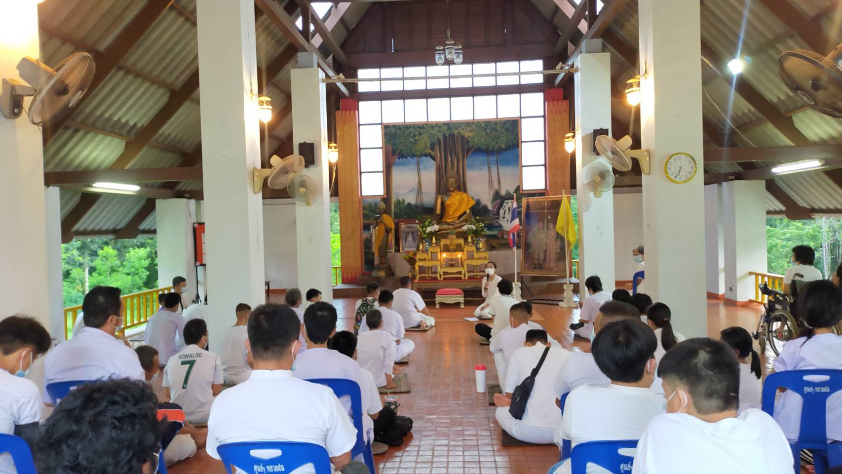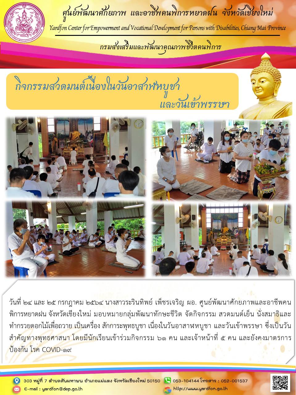 วันที่ 24 และ 25 กรกฎาคม 2564 นางสาวระรินทิพย์ เพ็ชรเจริญ ผอ. ศูนย์พัฒนาศักยภาพและอาชีพคนพิการหยาดฝน จังหวัดเชียงใหม่ มอบหมายกลุ่มพัฒนาทักษะชีวิต จัดกิจกรรม สวดมนต์เย็น นั่งสมาธิและ ทำกรวยดอกไม้เพื่อถวาย เป็นเครื่อง สักการะพุทธบูชา เนื่องในวันอาสาฬหบูชา และวันเข้าพรรษา ซึ่งเป็นวันสำคัญทางพุทธศาสนา โดยมีนักเรียนเข้าร่วมกิจกรรม 61 คน และเจ้าหน้าที่ 5 คน และยังคงมาตรการ ป้องกัน