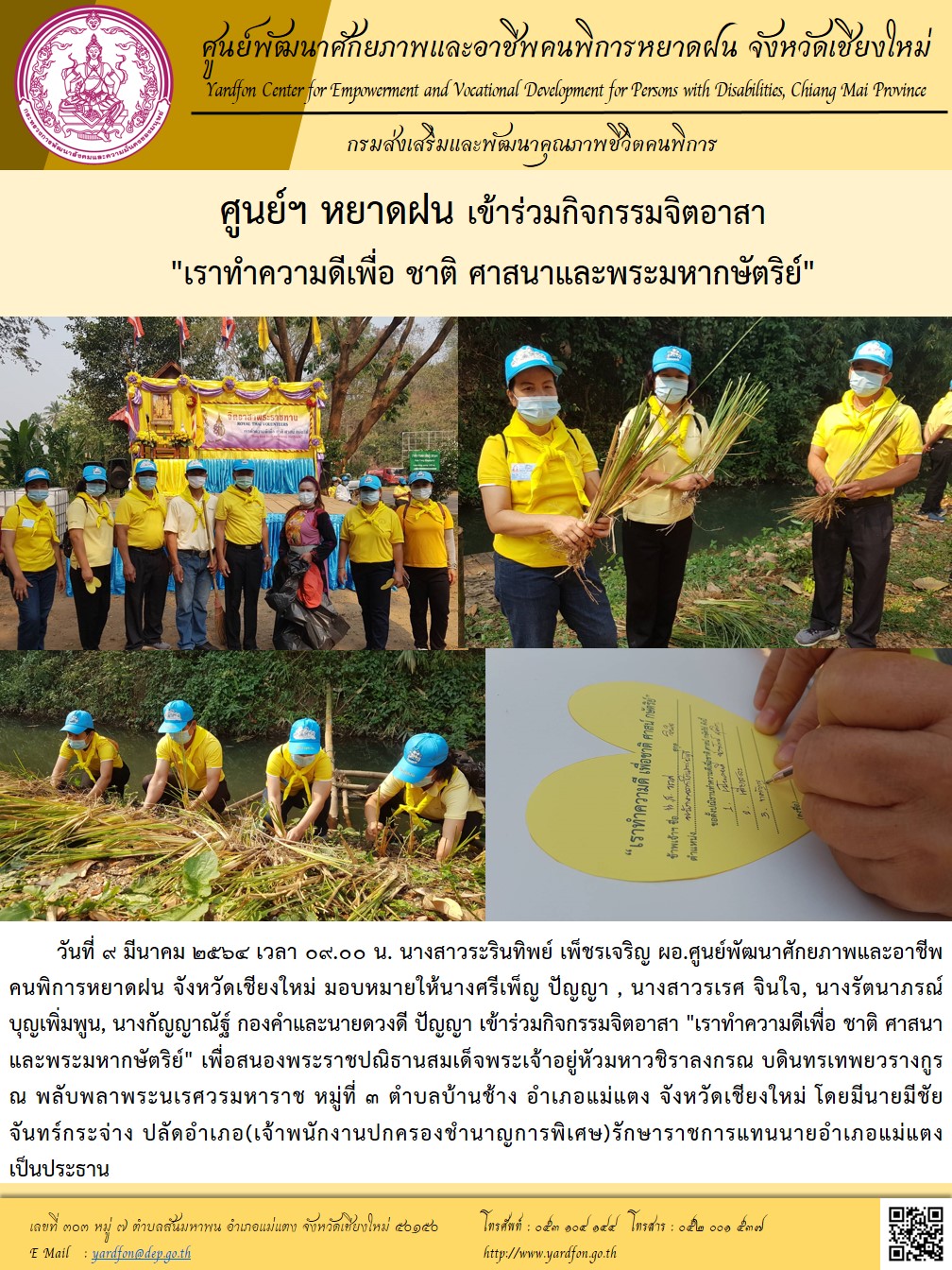 ศูนย์พัฒนาศักยภาพและอาชีพคนพิการหยาดฝน จังหวัดเชียงใหม่303 ม.7 ต.สันมหาพน อ.แม่แตง จ.เชียงใหม่ 50150 โทรศัพท์ 0-5310-4144โทรสาร 0-5200-1537E-mail : yardfon@dep.go.th