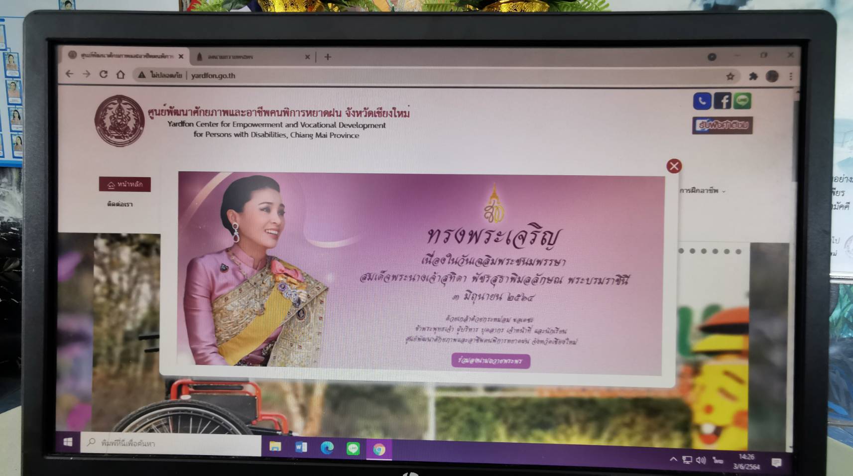 วันที่ 3 มิถุนายน 2564 ศูนย์พัฒนาศักยภาพและอาชีพคนพิการหยาดฝน จังหวัดเชียงใหม่ จัดกิจกรรมเฉลิมพระเกียรติสมเด็จพระนางเจ้าฯ พระบรมราชินี เนื่องในโอกาสวันเฉลิมพระชนมพรรษา