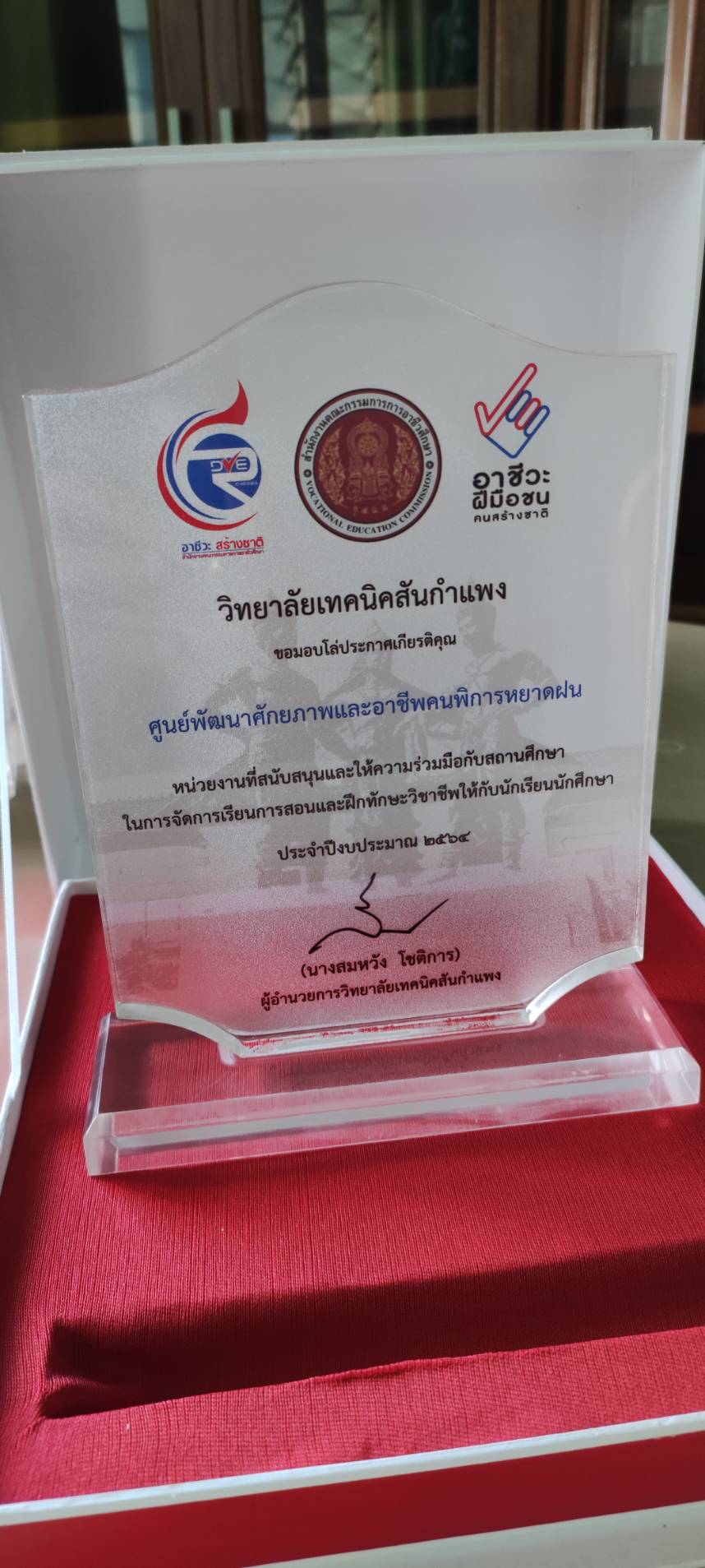 วิทยาลัยเทคนิคสันกำแพง จังหวัดเชียงใหม่ โดยนางสมหวัง โชติการ ผอ.วิทยาลัยเทคนิคสันกำเเพง มอบโล่เกียรติคุณ ให้ศูนย์พัฒนาศักยภาพและอาชีพคนพิการหยาดฝน จังหวัดเชียงใหม่ ในฐานะเครือข่ายสนับสนุนเเละให้ความร่วมมือกับสถานศึกษาในการจัดการเรียนการสอนให้กับนักเรียนนักศึกษาประจำปีงบประมาณ 2564 โดยมีนางสาวระรินทิพย์ เพ็ชรเจริญ ผอ.ศูนย์พัฒนาศักยภาพเเละอาชีพคนพิการหยาดฝน จังหวัดเชียงใหม่ รับมอบ พร้อมนายอรรถวุฒิ พึ่งเนียม นายอำเภอแม่แตง และส่วนราชการในพื้นที่ร่วมแสดงความยินดี ทั้งนี้กิจกรรมดังกล่าวได้ปฏิบัติตามมาตรการป้องกันการแพร่ระบาดโรค COVID-19