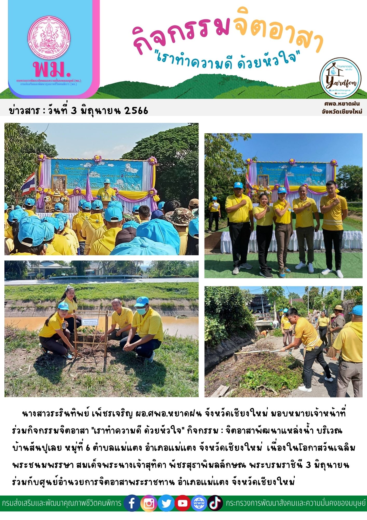 นางสาวระรินทิพย์ เพ็ชรเจริญ ผอ.ศพอ.หยาดฝน จังหวัดเชียงใหม่ มอบหมายเจ้าหน้าที่ร่วมกิจกรรมจิตอาสา "เราทำความดี ด้วยหัวใจ" กิจกรรม : จิตอาสาพัฒนาแหล่งน้ำ บริเวณบ้านสันปูเลย หมู่ที่ 6 ตำบลแม่แตง อำเภอเเม่เเตง