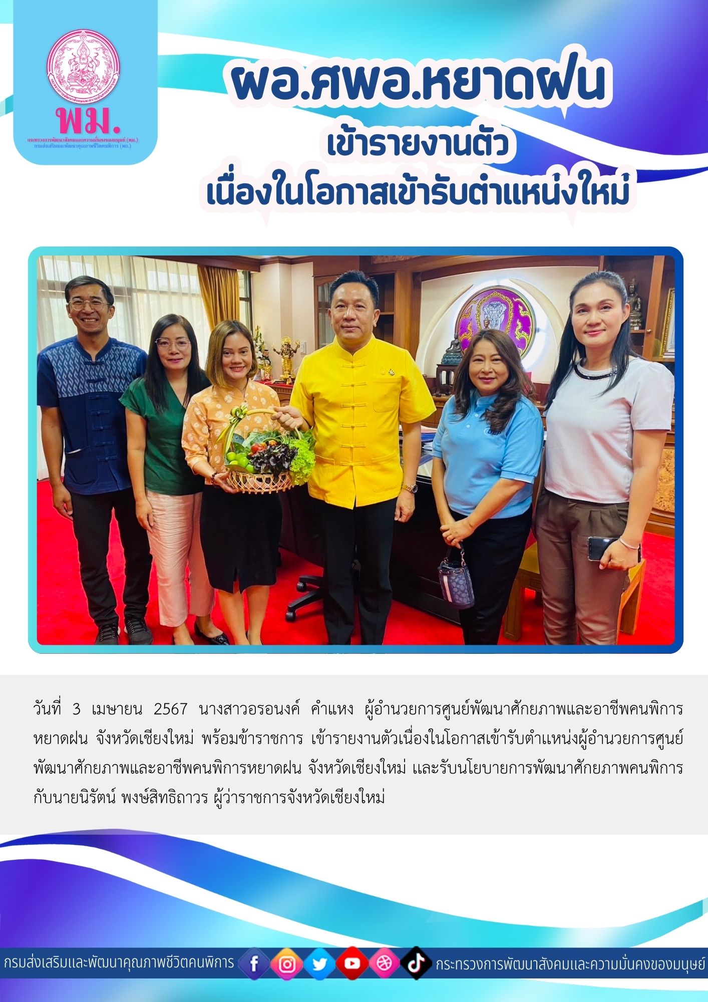 วันที่ 3 เมษายน 2567 นางสาวอรอนงค์ คำแหง ผู้อำนวยการศูนย์พัฒนาศักยภาพและอาชีพคนพิการหยาดฝน จังหวัดเชียงใหม่ พร้อมข้าราชการ เข้ารายงานตัวเนื่องในโอกาสเข้ารับตำเเหน่งผู้อำนวยการศูนย์พัฒนาศักยภาพและอาชีพคนพิการหยาดฝน จังหวัดเชียงใหม่ เเละรับนโยบายการพัฒนาศักยภาพคนพิการ กับนายนิรัตน์ พงษ์สิทธิถาวร ผู้ว่าราชการจังหวัดเชียงใหม่